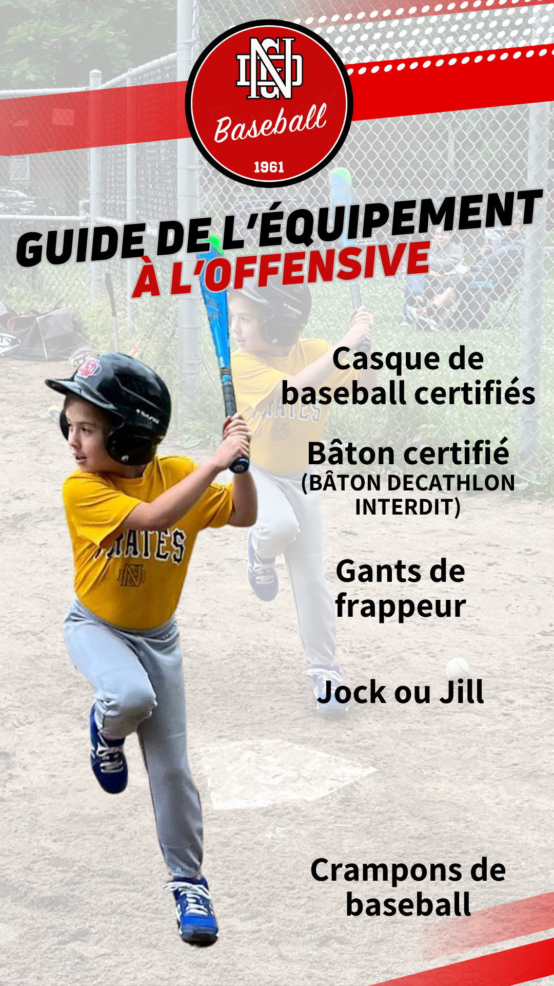 • Bâton de baseball certifié (consultez le règlement de la BQ avant l’achat). Les bâton de la marque Decathlon ne sont pas certifié et sont interdites.